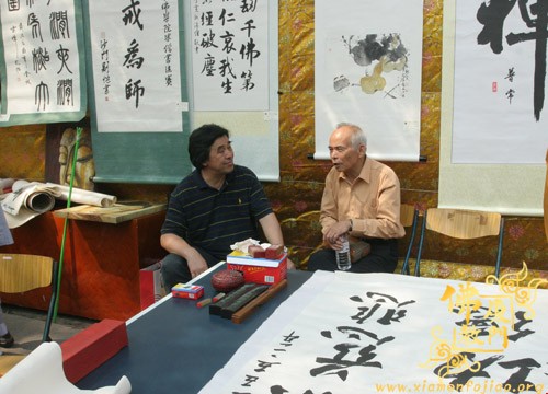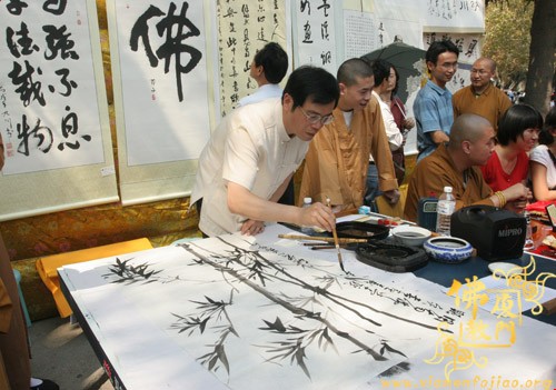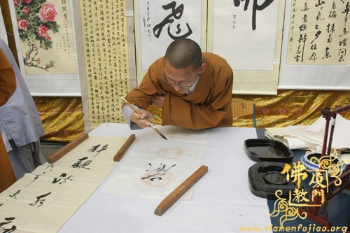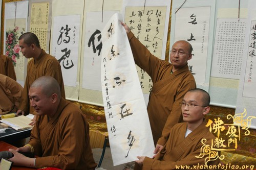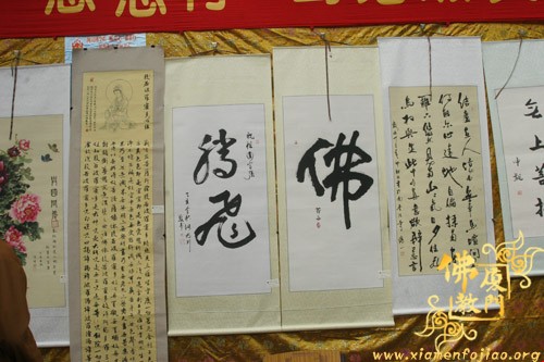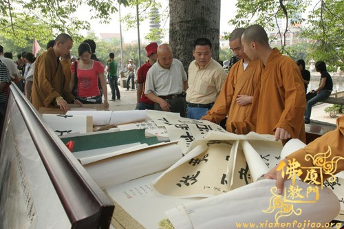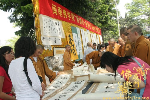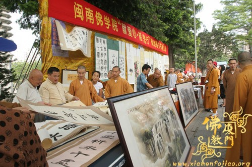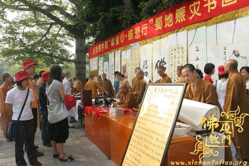 【厦门佛教在线】5月17日报道:今天上午8点,闽南佛学院举行“献爱心 慈悲行”蜀地赈灾书画义卖活动,为期2天。中国书法家协会会员、厦门书法家协会副主席李诗斌,中国美术家协会会员、福建省书法家协会会员黄福坤,中国画创作室刘守信等知名书法家、画家参与此次书画义卖活动。现场气氛活跃,大家积极参与,为蜀地灾民奉献爱心。
