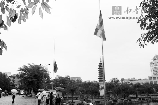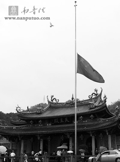 今晨,厦门南普陀寺和紫竹林寺国旗、教旗分别下半旗志哀,并于下午14时28分撞钟108下,以表达对四川汶川大地震遇难同胞的深切哀悼。是时,寺内所有僧众、香客肃立默哀3分钟,现场气氛十分凝重。