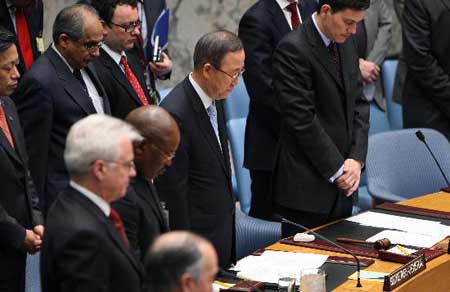 联合国秘书长潘基文(中)与安理会成员集体默哀。