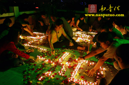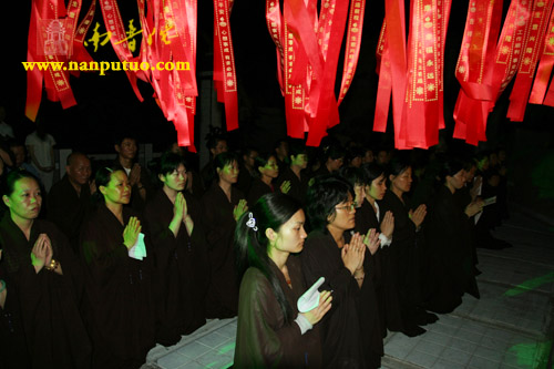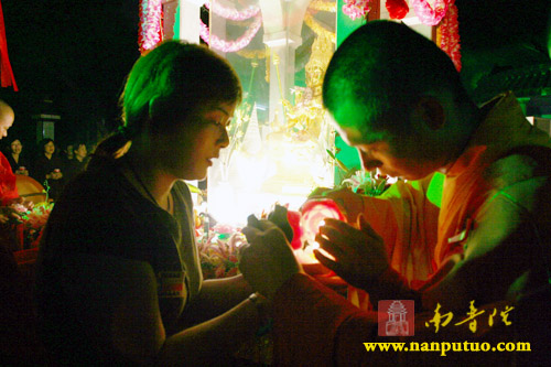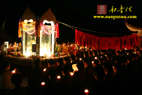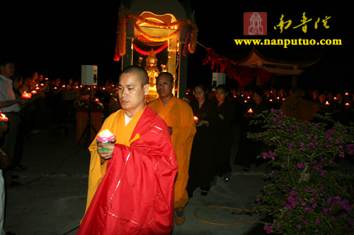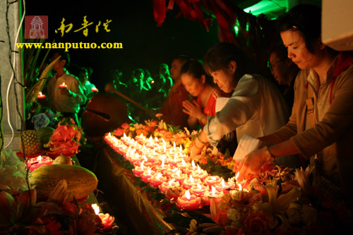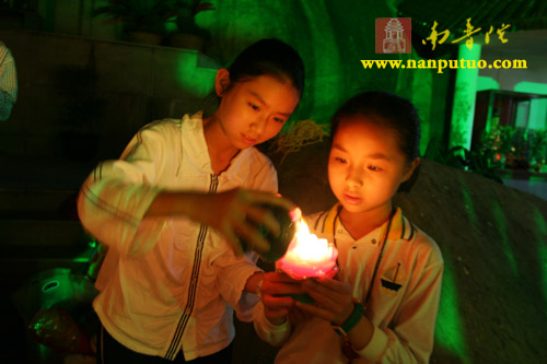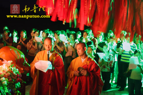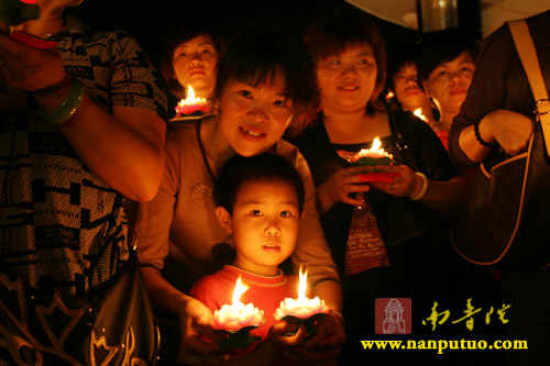 夜幕下,中岩寺四面佛像前,数百名信众整齐列队静静等候着传灯法会的开始。7时整,主法开悟法师在僧俗二众代表的迎请下步入法会现场,是时,香烟缭绕,梵呗声声,开悟法师祝愿代表和平与智慧的佛法,像绵绵无尽的灯光,永远发扬光大,希望善良和吉祥永远陪伴着芸芸众生。点灯仪式开始,信众们手捧着莲花灯,寄语“平安吉祥、合家安康”,祈祷“世界和平、国泰民安”,以一灯传千灯,法会现场在烛光的照耀下,一派祥和。唱诵经偈、宣祈愿文、佛曲合唱共历时一个多小时,最后,法会在两位可爱的小朋友领唱《感恩的心》的动人童音中圆满结束。