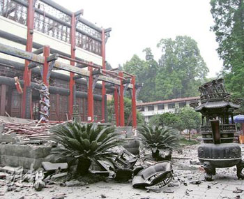 潘月荷遇事的地点都江堰青城山普照寺,在地震中损毁严重,石柱震碎,木制结构被震至倒塌。
