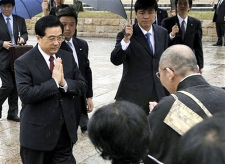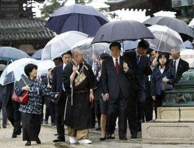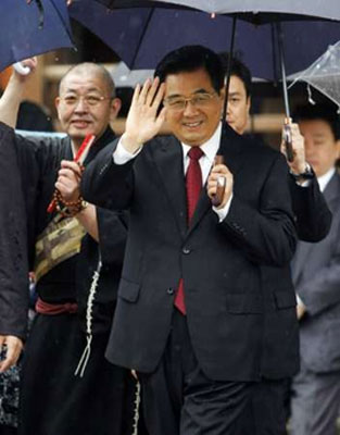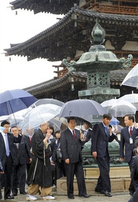国家主席胡锦涛在日本5月10日在日本进行最後一日访问。图为他早上冒雨到奈良的法隆寺参观。