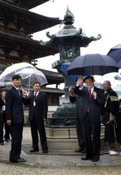 胡锦涛主席雨中参观法隆寺 亲自撑伞招呼群众