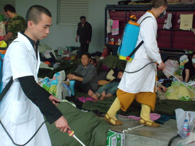 道坚法师对灾民居住地进行消毒