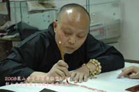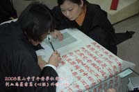 约下午1时,抄经活动开始,伴随着众社员的大悲咒唱诵,陈乃宇社友用隶书至诚书写《般若波罗蜜多心经》、《净口业真言》、《普事一切善知识、志求无上佛菩提》佛学社训,黄晓宁社友以篆体书写《般若波罗蜜多心经》一遍,抄写活动直至下午4时许圆满结束。