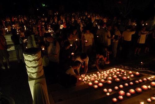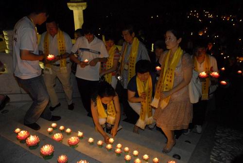 6月28日,当炙烤大地的太阳西沉、夜幕降临华灯初上的时候,著名的佛教盛地———西安大雁塔慈恩寺内,约3000多名高僧大德、佛门信徒和观光的市民,在和平钟声和祈愿声中,点燃起一盏盏美丽的莲花灯,为地震灾害中受难的亡灵超度,为劫后余生的同胞消灾及美好的明天祈福。