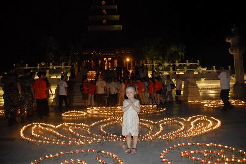 盏盏莲花灯熠熠闪亮。人们手捧着灯,小心翼翼地把灯放置在台阶上,地面上由灯光组成的“祈福”二字,闪亮在大慈恩寺,闪亮在人们的心头。增勤方丈和梁诚威先生激动地说,我们点燃的是盏盏心灯,这灯象征着光明,象征着辉煌,我们希望灾区人民早日度过黑暗,迎来明日的光明,也希望灾区的儿童能早日坐在明亮的教室里读书,将来成为祖国的栋梁之才。