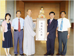 台北市“东山高中”全体师生获悉四川发生地震后,立即发动该校师生为四川同胞募捐善款,并将全部善款捐助给法鼓山做为四川赈灾之用。法鼓山关怀院监院法师果器法师接受捐赠。法鼓山果器法师回赠“东山高中”字画表示感谢。