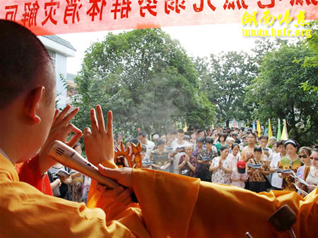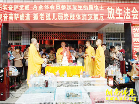 2008年7月23日上午,湖南省佛慈基金会为纪念韦驮菩萨圣诞、观世音菩萨成道,在办公楼前为全体会员、参加放生的居信士、孤老孤儿、弱势群体举行了消灾解厄放生法会,近一千人参加此次法会。