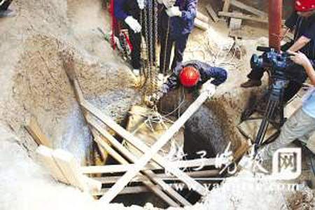 去年年底,确定了塔基;今年4月,发现了地宫。到目前来看,地宫直径为2.2米,深5米,其建造是很规范的,一层石块加一层夯土,在对地宫内部进行清理时,到达4.2米深时,发现了石板,从大前天开始,2块石板被起吊,一层铜钱显露出来。“这些铜钱,原先是用绳子串起来的,几百年来,绳子烂掉了,铜钱就散落了,在铜钱之下,是一个80厘米长宽的石函。”因为铜钱上尽是泥土,所以字迹分辨不清,要等进一步清理。华国荣介绍,这个石函是放在四个石板砌起来的空间里的,从常规来看,石函中一定是“有东西的”。另外,从被吊起的石板来看,上面没有文字记录。