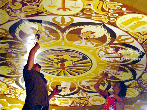 作为灵山三期景区主建筑的梵宫,是无锡近年来少有的精美文化设施。其装饰件木雕、石刻、油画等全部取材于国内最高水准的艺术精品。敦煌艺术研究院美术研究所受邀为门厅走廊6个直径近10米的穹顶及侧边拱券绘制装饰画。目前,6个庞大的穹顶中已有两个完成了装饰画的绘制,15位画家正分散在余下4个的下面,分头进行绘制工作。随着画笔的延伸,美丽曲折的莲花在一朵朵绽开,端庄的佛像闪现出璀璨神圣的光芒……虽然有几个年轻的小伙子赤膊上阵,但年纪稍长的几名画家都是气定神闲,似已和作品融为一体。