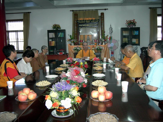 在法堂,宽容法师向朝礼团一行介绍了三祖寺的历史和禅宗法脉传承概况。指出:三祖寺是一座千年古刹,历尽沧桑、兴兴废废,当年三祖僧璨大师在此隐修时,正是北周法难时期,僧璨大师在艰苦卓绝的条件下,使禅宗法脉得以传承,并著《信心铭》,第一次用书面语言系统性地概况禅宗思想,为禅宗的普及创造了条件。