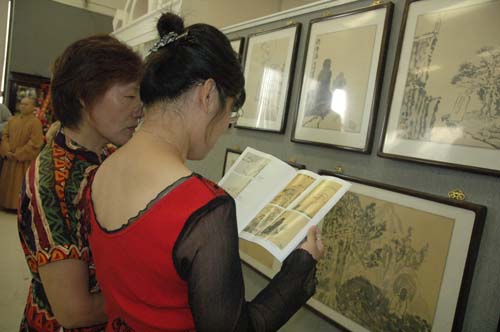 传义大和尚向陈怀之参赞介绍他的书画作品