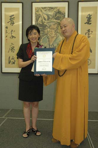加州税务委员赵美心博士向传义大和尚颁赠表扬奖状,肯定其书画对中美文化交流作出的贡献
