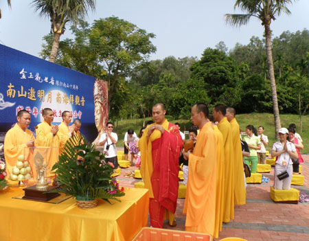戊子年乃金玉观音缘归南山十周年,此次法会也是系列庆典活动之一。当日,南山寺40名僧侣还引领信众和游客举行了邀月和拜月仪式。