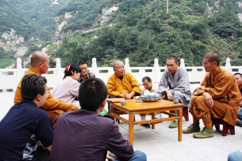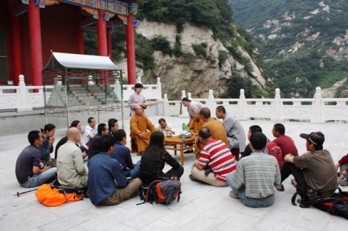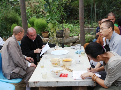 在观音禅院,久已等候在山门口的当家法师准备了丰盛的午饭,此刻,大家正是饥肠辘辘,无声无息间,米饭面条都被吃的干净。果宣法师在观音阁前支起茶桌,与大家交流畅谈,身边沣水滔滔,周围青山环绕,席地而坐,身心顿歇,果宣法师的开示也如那供僧第一天的秋雨,浇透了每个身临其境的佛子心田,回到兴教寺时,将要圆满的明月正悄悄爬上少陵原畔。