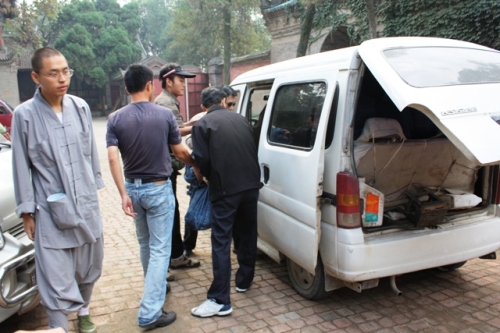 我们先将嘉五台前山的道粮送至白道峪口的一天门,车行山下拐弯处看见一位法师在路边等车,仔细一看,原来是第一届供僧我们送到茅蓬外还在闭关的比丘尼师父,记得那次到她的茅蓬外时,她正在闭关止语,院墙也用砖封起来,我们是通过从墙上吊下来的绳子将物资送进去的。如今,她已出关,我下车向她讲了我们来供僧,由于时间紧张,物资都在一天门罗贵法师处,请她注意查收。她深深的向我合十,我还礼后便带着大家来到嘉五台山下。