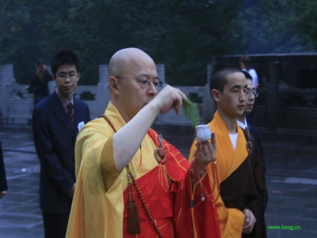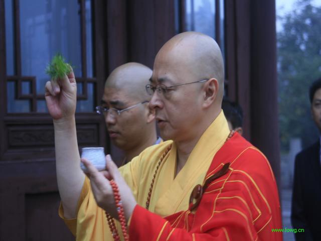 杨枝净水赞称圣号:菩萨柳头甘露水,能令一点偏十方。腥膻垢秽尽除,令此壇场悉清净。诵大悲咒,正主法说法语大众齐诵开光咒、佛宝赞。
