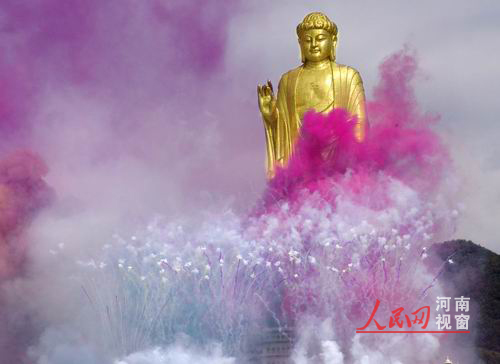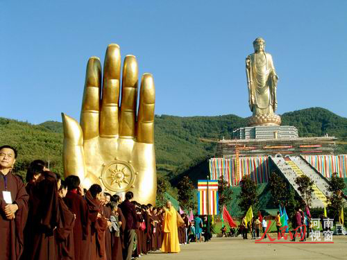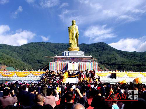 世界第一大佛中原释迦在河南鲁山佛泉寺开光 2008年9月29日,世界第一大佛中原释迦大佛落成开光庆典暨祈祷国泰民安大法会在中国河南省鲁山县佛泉寺隆重举行。208米高的世界第一大佛,108位海内外高僧大德及数万僧俗四众弟子,共同成就了一场世纪佛教盛典。中国佛教协会会长、中国佛学院院长、北京法源寺方丈一诚长老、、香港佛教联合会会长觉光长老、台湾佛光山开山宗长星云长老及两岸四地108位释迦高僧大德走上主礼台,以最隆重的佛教礼仪联袂为大佛开光,并祈福风调雨顺、国泰民安。 据悉,被誉为世界第一大佛中原释迦大佛,高208米,用铜330吨,黄金108公斤,由河南省平顶山市天瑞旅游集团投资4亿多元兴建。