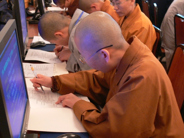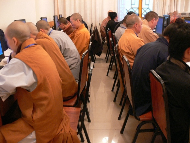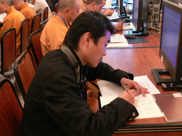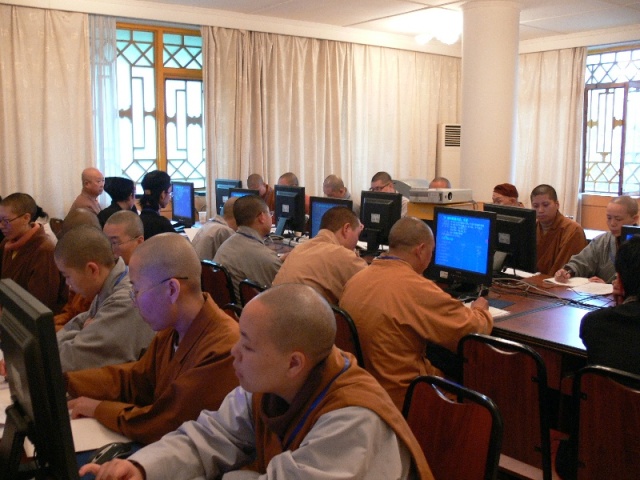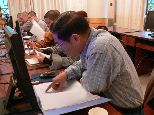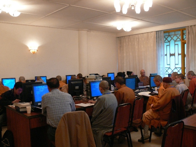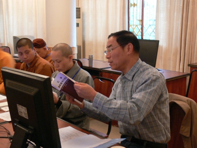 中国佛网讯 2008年10月29日下午1点30分 重庆华岩寺、成都文殊院联合举办的佛教图书馆管理人员培训班在华岩寺觉初佛教图书馆电教室内正式开课,第一节课由浙江大学退休副馆长周子荣教授为各位学员讲解管理佛教图书的基本知识,各位学员听得非常认真,接下来将在华岩寺持续展开三天的学习,11月2日前往成都文殊院学习。