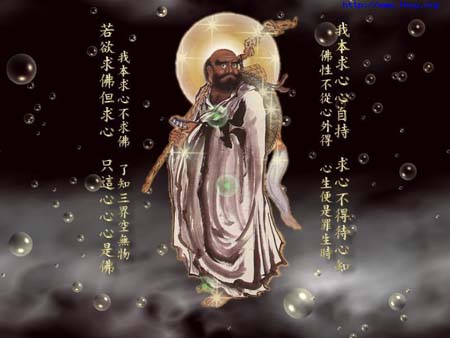 菩提达摩(通称达摩),是中国禅宗的初祖。他生于南印度,婆罗门族,出家后倾心大乘佛法。梁普通年中(520--526,一说: 南朝宋末),他自印度航海来到广州,从这里北行至魏,到处以禅法教人。据说他在洛阳看见永宁寺宝塔建筑的精美,自言年已一百五十岁,历游各国都不曾见过,于是“口唱南无,合掌连日”(《洛阳伽 蓝记》卷一)。