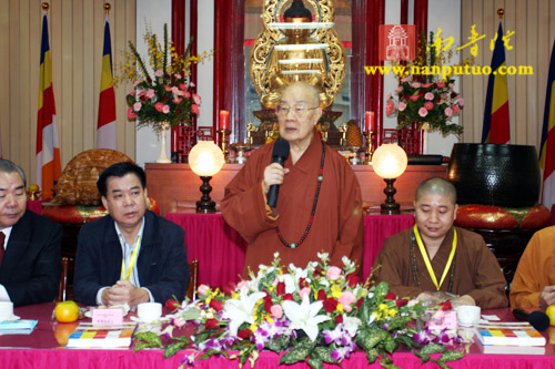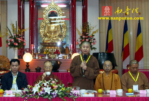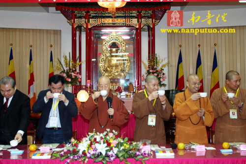 在欢迎会上,净良长老、心茂法师和郭俊次居士分别发言,并在讲话中肯定了参访团此次访台的重大意义,他们认为现在海峡两岸的关系像是闹别扭的两兄弟,等心平气和后就会和好的,而佛教的作用就是起到加快两兄弟和好的脚步。参访团团长则悟大和尚对净良长老以及各地佛教会的大德、法师和居士对参访团的热情招待十分感谢,同时大和尚表示,要与各位大德一起努力,促进两岸的进一步交流。由于则悟大和尚有事在身,用完午餐之后,不得不与净良长老和诸位法师道别赶回厦门。之后,由名誉团长慧然法师带领团员们继续参访下一站——花莲。