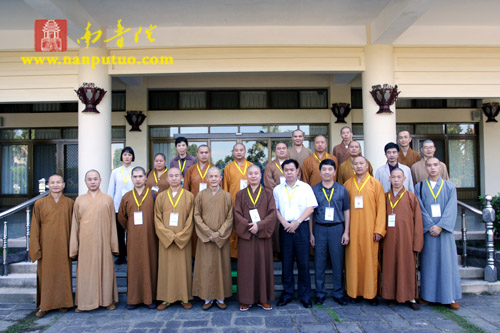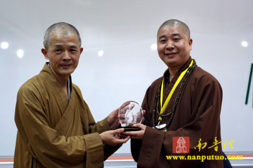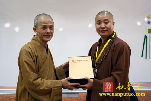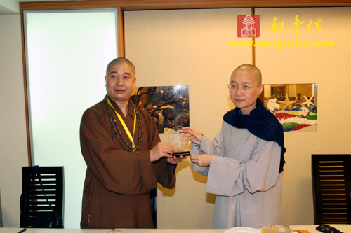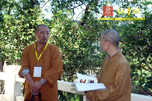 闽院办公室主任净心法师和福严佛学院院长净照法师交谈中