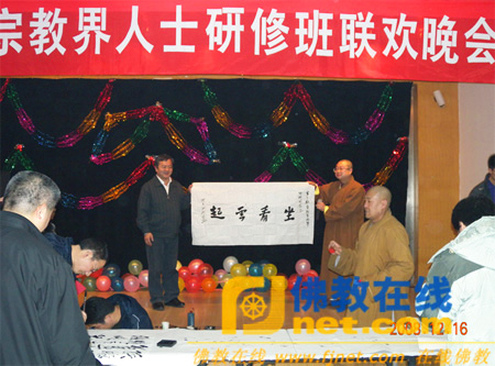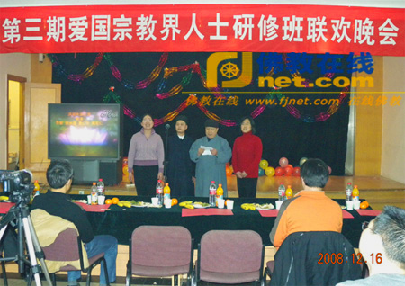 佛教在线北京讯 2008年12月16日,中国人民大学举办了第三期爱国宗教界人士研修班结业联欢晚会。中央统战部二局袁沙副局长、二局宗教工作一处倪智泉副处长,中国佛教协会常务理事、湖北省佛教协会会长、东方山弘化禅寺方丈正慈法师,北京市佛教协会副会长、北京通教寺住持思智法师,山东淄博普照寺住持仁昌法师等佛教人士及其他宗教界人士和相关领导等出席了此次晚会。