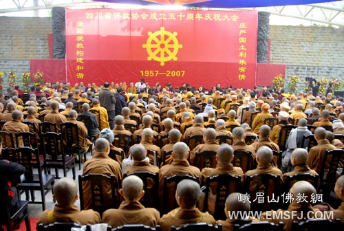 2008年12月14日下午,四川省佛教协会成立50周年纪念大会在峨眉山大佛禅院隆重举行。四川省佛教协会第八届理事会全体理事,省佛教协会咨议委员全体委员,各市(州)佛教协会会长、秘书长,各寺院负责人参加了纪念大会。中国佛教协会咨议委员副主席、重庆市佛教协会会长惟贤长老,中国佛教协会副会长兼秘书长学诚法师、中国佛教协会副秘书长蘧俊忠等也出席了纪念大会。出席此次纪念大会的各级领导有国家宗教局副局长蒋坚永,四川省人大副主任张东升,四川省政协副主席、省委统战部部长陈光志,四川省委统战部副部长、省宗教局局长王增建,乐山市政协副主席、市委统战部部长雷有成,峨眉山市委书记、市人大主任陈忠义等。参加纪念大会的嘉宾还有省道教协会、省伊斯兰教协会、以及全省二十一个市州宗教部门的各位领导和部分居士信众。