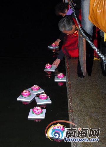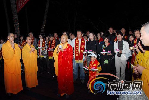 智法法师率10名僧众颂经梵唱,举行祈福迎新放生、放灯法会。在法会现场,除了108名撞钟的信众和游客,还有来自世界各地的100多名游客参加。智法师手持净水,为信众和游客洒净开示。200名信众和游客在南山寺法师的祈福加持下,每人手捧一盏莲花灯,走到放生池边祈愿放灯。很多信众和游客在放灯后,还请购长寿龟和鲤鱼放生。