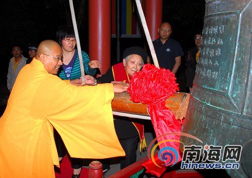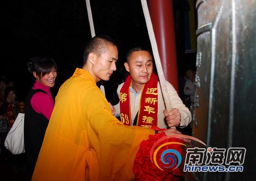 据南海网消息,2008年12月31日晚,在三亚南山景区的吉祥钟亭,来自世界各地的数百名信众和游客以中国撞钟迎新的传统习俗欢庆新一年的到来。在辞旧迎新的零点时分,央视四套、九套同时播放了三亚南山寺撞吉祥钟迎新年祈福国泰民安的盛况。