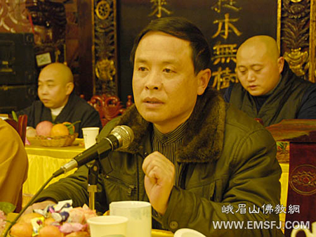 座谈会由报国寺知客传灯法师主持,峨眉山——乐山大佛景区管委会宗教局局长李黔、副局长袁纲分别在会上发言,充分肯定了峨眉山佛教协会在过去的一年里所取得的成绩,尤其对峨眉山佛教在抗震救灾工作中所作的杰出贡献表示赞叹,希望在来年百尺竿头,更进一步,并对大家致以新春的节日问候。
