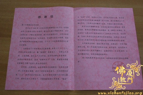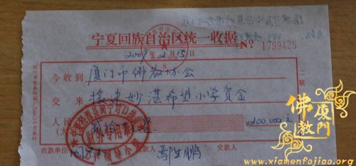 今年元月7日,市佛协委派忠明副秘书长和李建群居士二人至宁夏自治区泾源县大湾乡考察原本教学条件简陋,又受5.12地震影响的牛营村、董庄村二个小学。回厦门之后即向市佛协驻会领导汇报。经办公会议研究并报市佛协副秘书长以上领导同意。市佛协决定将佛教界筹集的五十二万元善款以及市佛协的八万元捐款,合计六十万元拨付给宁夏泾源县政府,作为专款在大湾乡兴建希望小学。