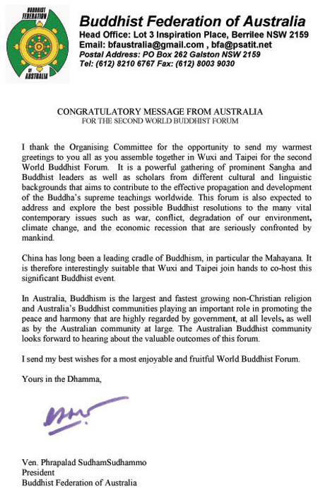 澳大利亚佛教联合会主席Ven. Phrapalad Sudham Sudhamo致第二届世界佛教论坛贺电: