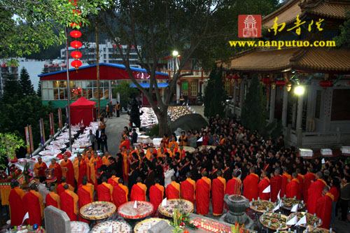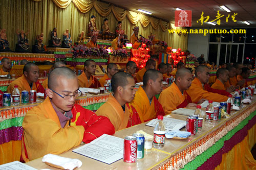 晚5时30分,大雄宝殿外,整齐摆列着近两百张桌子,供品花色饮食不一。 今晚由传航法师、常明法师、演双法师、果君法师、本藏法师五大士领众施放圆满瑜伽焰口,这是水陆法会最后一堂焰口。大坛内,五大士端身上座,头戴毗卢帽、口诵真言、手结密印、意存观想、神情肃穆、法音称扬。现场的气氛,法会的庄严,令参加水陆的护法善信,满心欢喜,尽享法味。