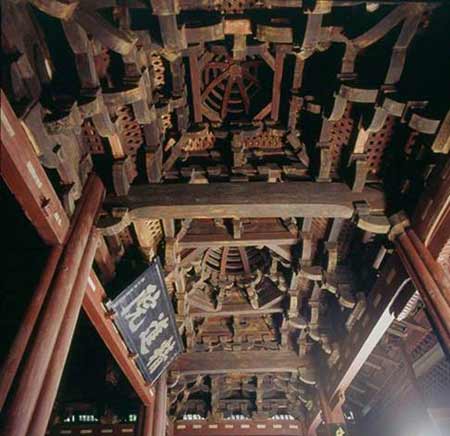 正是因为大殿的倾斜,再加上其框架、斗拱、藻井等结构复杂,鸟很难在上面筑巢,鸟蛋容易滚下来,幼鸟也容易摔落,所以即便是千年古刹也很难见到飞鸟。同时,这一种倾斜也让灰尘难以久留,因为殿内南北纵深很长,穿堂风效应明显,所以只要有风就容易把灰尘吹走。至于虫子少,则可能和木质为黄桧相关,散发的香气使虫子难以接近,还可能与斗拱层层而上形成螺旋效应气流有关。如果人把耳朵贴于柱子,确实也能听到如海螺形状镂空的木藻井里不绝于耳的细啸声,虽然很微弱但这对于飞虫已经足够了。没有飞虫,蜘蛛似乎也没有必要在这里结网了,况且它也真的可能受不了黄桧木的味。