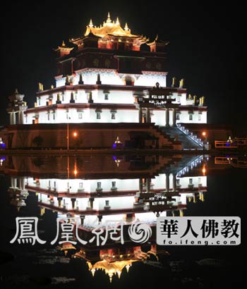 夜色中的五印坛城别有一番意韵,金色的顶、红白两色的建筑,与宁静的香水海融为一体,周围一片寂静、一片祥和。