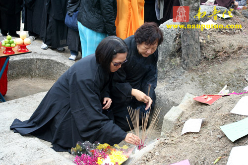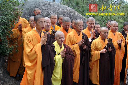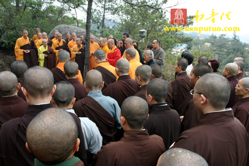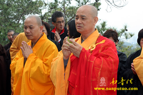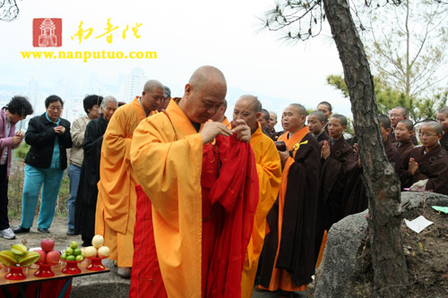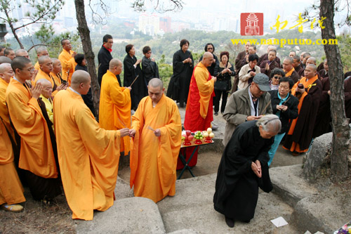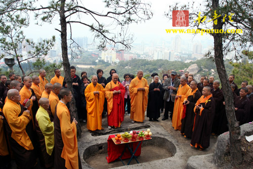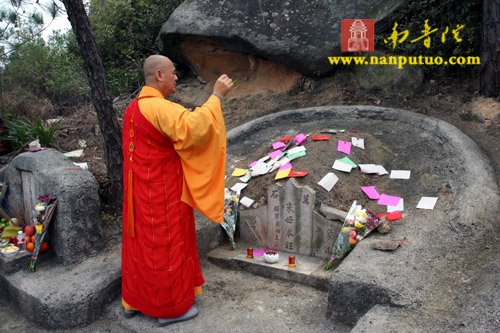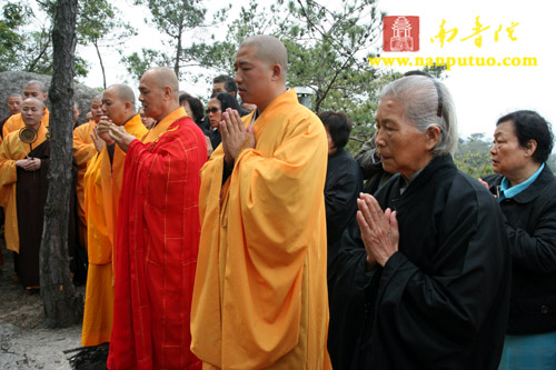 3月3日中午12时,新加坡光明山普觉禅寺方丈广声大和尚携新加坡护法居士赴万石莲后山,在宏船老和尚母亲墓前上香礼拜,举行庄严的祭祀仪式。虎溪岩寺监院净心法师、副寺兼知客向协法师,中岩寺监院开悟法师以及万石莲寺开因姑、监院向佛法师等各带领寺内僧众一同参加了祭祀仪式。