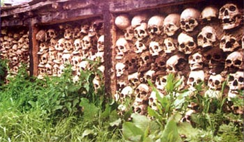 在西藏,人死后尸体全部喂鹰鹫,不留一点,唯独藏北的比如县达摩寺内的多多卡天葬台,保留了众多死者的头骨,此举堪称世界一绝。子文在他的《苍茫西藏》中写道:“原先达木(实为一地。由于是音译,各作者所用汉字也不同)天葬台三面是骷髅墙,有一人多高,后来在一个大雨如注的日子,浊水从山上滚滚而下,天葬台的墙倒了。现在的两面骷髅墙,是用剩下的骷髅在近几十年内慢慢垒砌而成的。现在剩下的这两堵墙只有原来的一半高。”