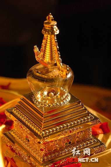 释迦牟尼佛舍利被装在一座金光灿灿的舍利塔中。