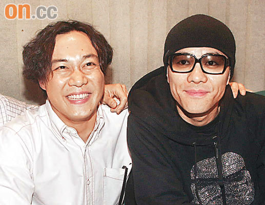 陈奕迅(左)与梁汉文一齐出席佛教录音活动