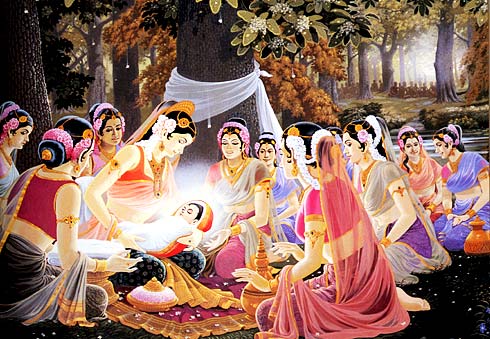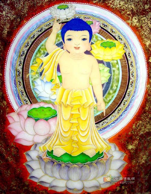 【浴佛】 浴佛的起源,是因悉达多太子在兰毗尼园无忧树下(亦称婆罗树或波罗叉树)降生时,九龙(亦说二龙)吐水洗浴圣身的传说而来。在古代,它已成为佛教故事中一个重要的题材。印度鹿野苑和阿摩罗伐底近代出土的佛传雕刻,都有这种情景的构图。据《过去现在因果经》卷一的记载,摩耶夫人怀胎临近产期,一日出游兰毗尼园,行至无忧树下,诞生了悉达多太子。难陀和伏波难陀龙王吐清净水,灌太子身。因此,后世佛教徒纪念佛陀诞生的仪式,都在佛堂中或露天下净地设灌佛盘,在盘中的莲台上安置着一手指天、一手指地的释迦太子金像,然后灌以香水,以表示庆祝和供养,就叫做“浴佛”或“灌佛”。这一天是佛教四众信徒的欢喜节日。