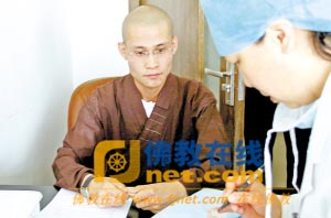 近日,山东省即墨市红十字会收到中华骨髓库传真,山东佛学院学僧寂通法师与北京的一名白血病患者初配成功。2009年5月12日上午,寂通法师在即墨市红十字会工作人员的带领下来到市中心血站采集血样。