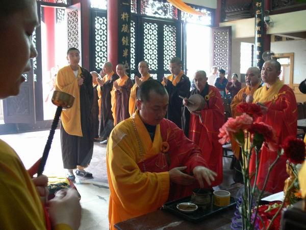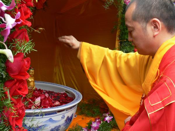 上午9时,华岩寺钟鼓齐鸣,浴佛仪式开始。四众弟子在大雄宝殿前整齐列队,高唱释迦牟尼佛圣号。释迦牟尼太子在香花、幢幡、宝盖及钟鼓齐鸣中,从华岩寺弘法楼恭迎至大雄宝殿。在礼敬佛陀之后,道坚法师执持金匙,盛水浴佛。四众弟子依次列队,同融法会,共浴佛身。一时华岩寺,香烟缭绕,人潮涌动,纷表至诚。