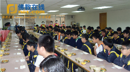 当天,一百多位学生,在讲堂以过堂形式由妙岸法指导用午斋。(图:赵世明)