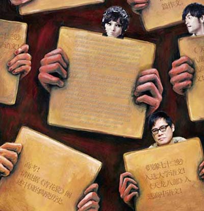 2009高考第一天,山东考生在哀鸣——当刘谦在春晚上聒噪“现在是见证奇迹的时刻”时,山东卷作文题已经给出来了:《见证》;而北京考生则轻松地哼着小曲——作文题目是张韶涵2007年上春晚的单曲《隐形的翅膀》,有考生当场就哼唱起来。能够入选国家选秀大典试题,是张韶涵的殊荣;当然她还比不上方文山,后者一阕《青花瓷》分别入围2008高考江苏卷、山东卷。