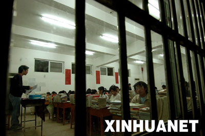 资料图片:2007年5月12日晚11时10分,安徽省舒城县一所中学的教室里,学生们还在考试。记者在江西、安徽、陕西等地的一些学校发现,初三、高三学生几乎全是早6点前起床,晚12点半后睡觉,周末补课现象更为普遍。中小学生课业负担过重,表面原因是来自学校和家长,功名化的教育价值观导致诸多扭曲现象;而深层次原因,是缺乏科学合理的教育评价体系,社会对学校和教师的评价过分看重升学率,减负自然成为“空中楼阁”。 新华社记者 陶明摄