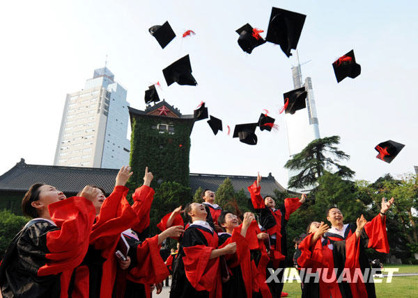 资料图片:6月18日,南京大学的一些应届博士毕业生在毕业典礼后把博士帽抛向天空。新华社记者 姜帆 摄