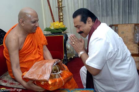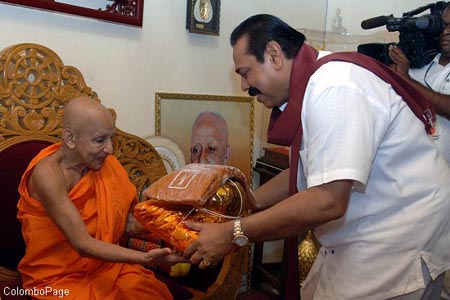 Following the religious activities the President has visited the chief incumbents of Most Ven. Agga Maha Panditha Udugama Sri Buddha Rakkitha thero of the Asigiri Chapter and the most Ven. Tibbatuwawe Sri Siddartha Sumangala thero of the Malwattha Chapter.