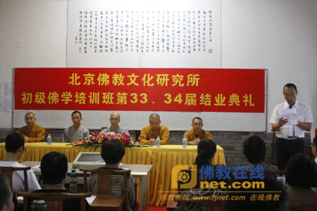 2009年8月22日上午,北京佛教文化研究所培训部第33、34届初级佛学初级培训班结业典礼在广化寺讲堂隆重举行。结业典礼由学习班学员广慧主持。培训部的定明法师、广常法师、永清法师、慧行法师、如性法师等授课法师出席了此次结业典礼。